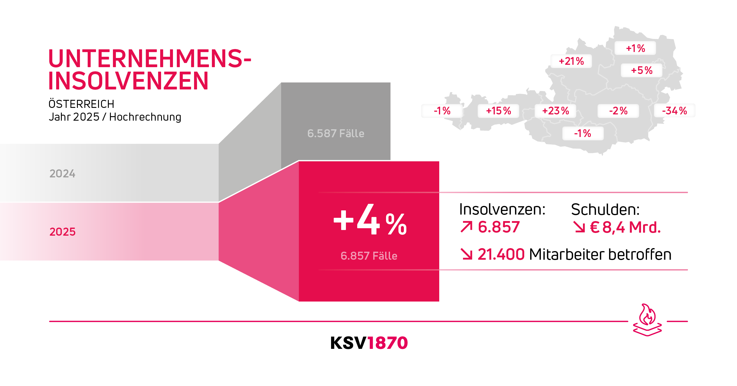Laut aktueller Hochrechnung des Kreditschutzverbands von 1870 (KSV1870) mussten im Jahr 2025 in Österreich 6.857 Unternehmen Insolvenz anmelden, das entspricht einem Anstieg von 4,1 Prozent gegenüber 2024. Im Durchschnitt rutschten damit neunzehn Betriebe pro Tag in die Pleite. Die vorläufigen Passiva belaufen sich auf rund 8,38 Milliarden Euro und liegen damit um 55,8 Prozent unter dem Vorjahreswert, was vor allem auf weniger sehr große Insolvenzen zurückgeführt wird.